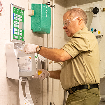 I denne sektion lærer du, hvordan du påfylder sprayflasker til rengøring, samt kemien i doseringsanlægget.