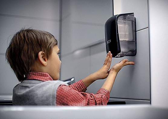 Moderne sorte dispensere, hvor du både kan få til papir, sæbe og desinfektion.