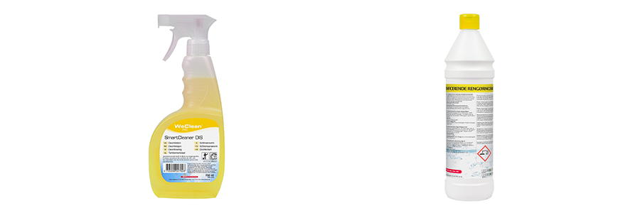 Det er også muligt at benytte et kombinationsprodukt, som både rengør og desinficerer samtidig. Her anbefaler vi både WeClean® SmartCleaner Dis varenr. 1279 som er klar til brug eller Desinficerende rengøringsmiddel varenr. 1282.