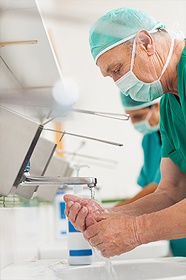 Udføres altid når hænderne er synligt beskidte eller våde, efter kontakt med patienter med infektiøs diarre og efter toiletbesøg. Håndvask udføres med vand og sæbe, som dispenseres fra en engangsbeholder.