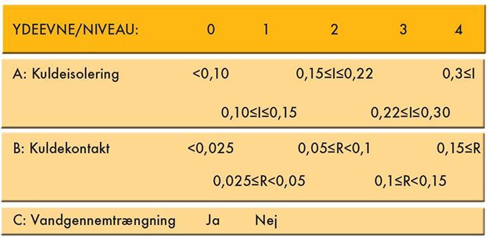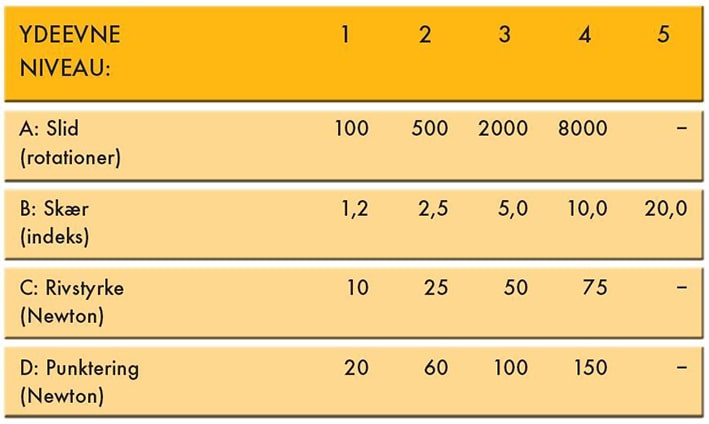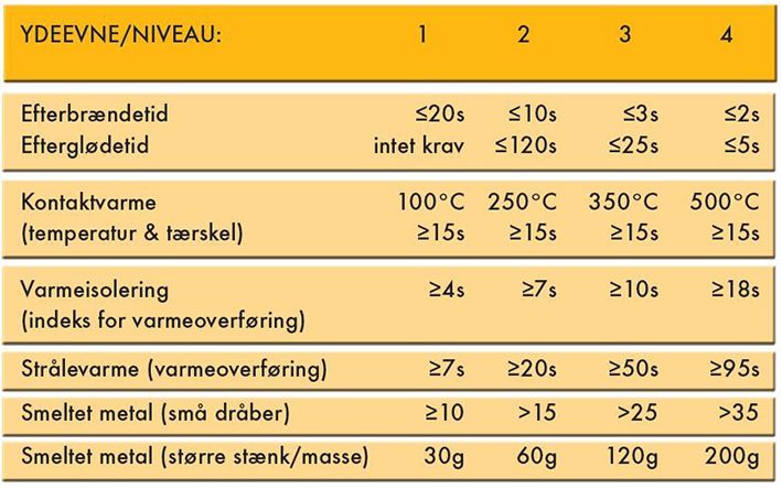 - Testet ved + 50°C, ved nærmere ønske om målinger, jvf. standarden. I testen vurderes desuden materialets fleksibilitet ved lave temperaturer samt krav fra EN 420 og EN 388.