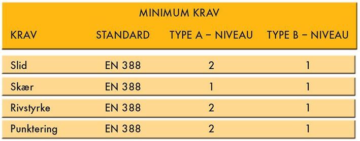 Anvendelige til mellemrisiko opgaver. Handskerne skal være testet og godkendt hos et uafhængigt testinstitut iht. EN 420 plus én eller flere standarder, som fx EN 374 og/eller EN 388. Handskerne skal være påført et piktogram der illustrerer beskyttelsesfunktion og CE-mærke.