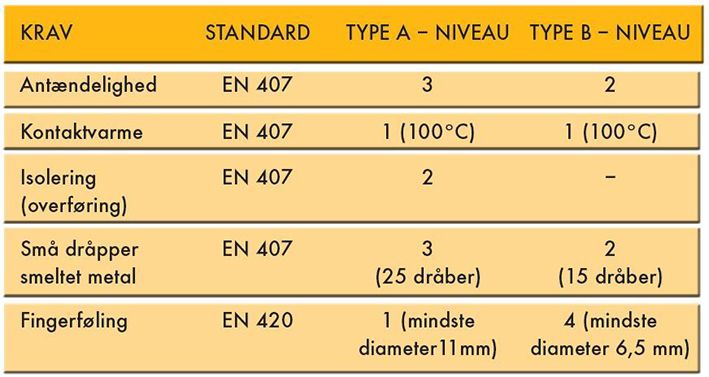 Type A: Produkter med mindre fingerføling, som er en mere resistent handske, rent varmemæssigt set.