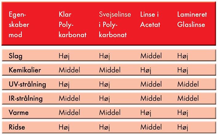 Af illustrationen nedenfor fremgår, hvilke linsematerialer, der beskytter mod forskellige påvirkninger som fx slag, kemikalier m.m. På de følgende sider, vil hver models egenskaber fremgå via symboler som vist til højre på denne side.