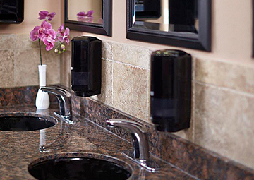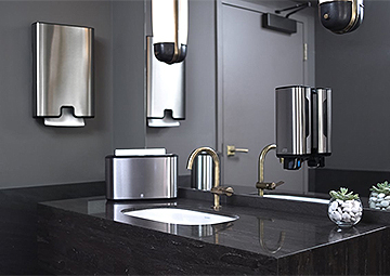 Forkæl dine gæster med moderne sorte dispensere, hvor du både kan få til papir, sæbe og desinfektion.