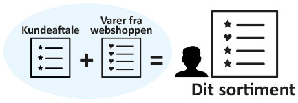 Dit sortiment består altså af de varer du selv har udvalgt i webshoppen eller dem vi opretter til dig + de varer du evt. har indgået en kundeaftale med os om.