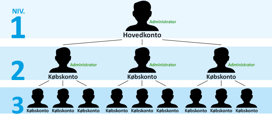 Du kan frit vælge hvordan du vil bruge de 2 niveauer. Hovedkontoen ligger som niveau 1 og typisk vil man bruge niveau 2 til sine områder/underafdelinger og niveau 3 til kunderne i de pågældende områder/underafdelinger.